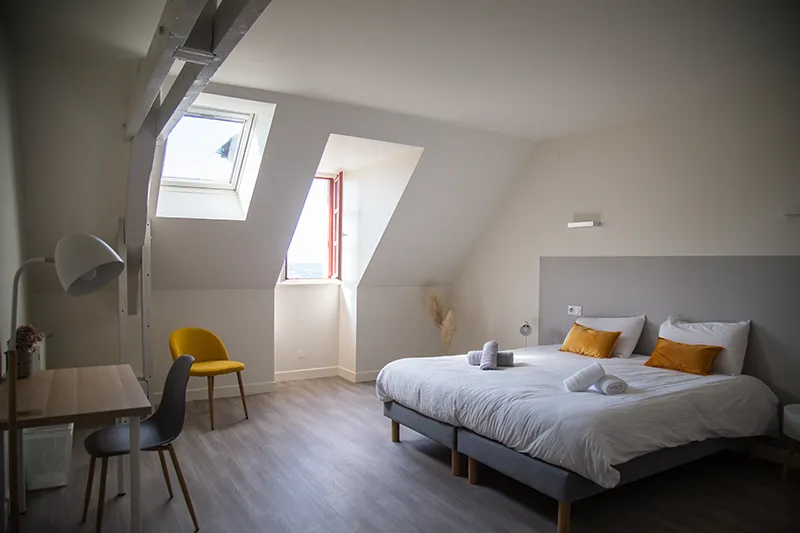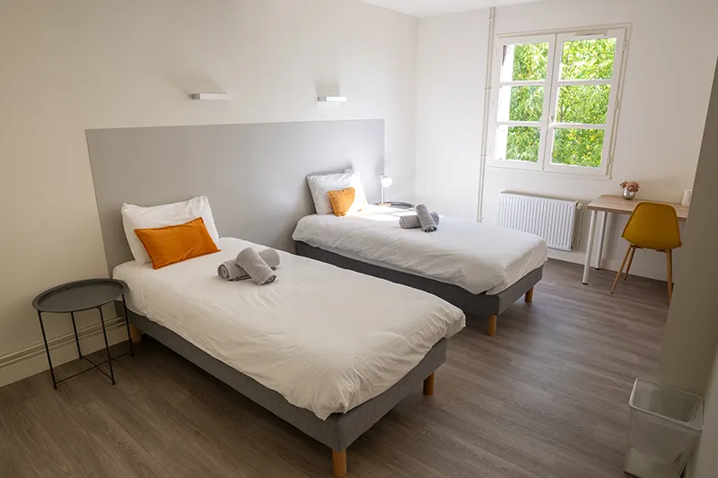 Toutes sont équipées de lits 90×200 modulables (en simple ou en double), d’une salle d’eau privative (douche ou baignoire), de toilettes indépendantes, d’un bureau et de grands rangements.